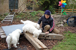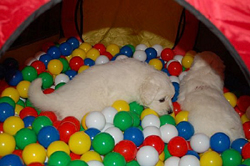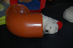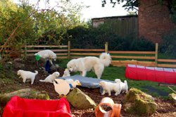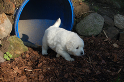 Je nach Wetterlage steht dann auch draußen ein Welpenauslauf bereit, der unterschiedliche Erfahrungsangebote bietet und nur darauf wartet, erobert zu werden. Dieser Auslauf kann dann mit zunehmenden Alter der Welpen auf den gesamtem Garten ausgedehnt werden, damit sie Erfahrungen sammeln können und ihr Wissen weiter ausbauen können. All dies geschieht natürlich unter sorgsamer Beobachtung und Begleitung durch die Mutter und uns, denn nichts wäre schlimmer, wenn ein Welpe in eine Situation geraten würde, die er selbst nicht lösen kann.