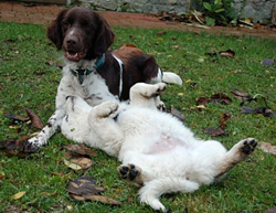 Wir züchten, was leider nicht mehr unbedingt selbstverständlich ist, mit unserer eigenen Hündin. Das heißt, die Hündin ist in unserem Besitz und lebt mit uns in ihrem beständigen Rudel. Auch die intensive Zeit der Aufzucht liegt allein in unseren Hände, denn nur so kann gewährleistet werden, dass die Welpen und die Hündin wirklich die Aufmerksamkeit, Geborgenheit und die Zuwendungen bekommen, die in dieser Zeit so wichtig sind. Dies ist auch der Grund, warum in unserer Zuchtstätte nur einmal - zweimal im Jahr Welpen auf die Welt kommen. Unser Schwerpunkt liegt ganz klar bei der Qualität und nicht bei Quantität. Wie schon an anderer Stelle erwähnt, leben wir mit unseren Hunden und nicht von unseren Hunden.