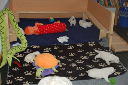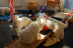 Nach ca. 4 Wochen ist umziehen angesagt, da die Welpen dann eine derartige Mobilität entwickeln, dass das Welpenzimmer zu klein ist. In dem neuen, größeren Zimmer, erwarten die Welpen nach und nach viele neue Möglichkeiten, ihr Umfeld zu entdecken und zu erkunden und hierbei sich und auch ihre Artgenossen besser kennen zu lernen.